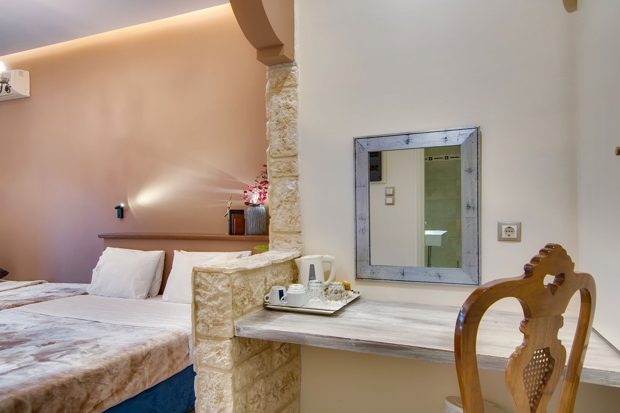 Τα Superior τρίκλινα δωμάτια βρίσκονται στο ισόγειο του POLITIA και είναι διακοσμημένα σε μοντέρνο vintage στιλ.